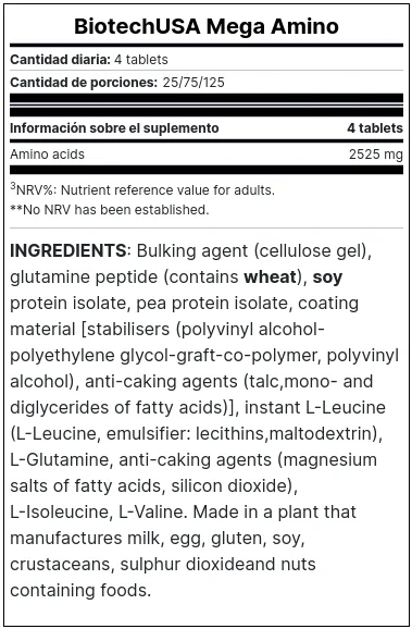 Mega Amino de BioTech USA son comprimidos que contienen una mezcla de todos los aminoácidos esenciales, no esenciales y condicionales así como una dosis de aminoácidos ramificados. Los aminoácidos son necesarios para que tu cuerpo construya las proteína de tu músculo, además protegen la masa muscular durante la actividad física y reducen la sensación de cansancio.